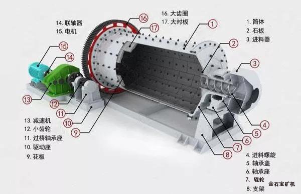 两种球磨机的结构基本相同,主要是由筒体部、给矿部、排矿部、轴承部、传动部和润滑系统等组成。