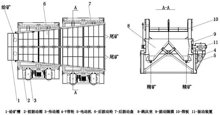 2LTC6109-8T梯形跳汰机,该机横截面为梯形,沿着矿流方向由窄变宽,矿浆流速逐渐减缓,特别有利于细粒重矿物回收。整机由8个跳汰室组成,分成两列,每列4室,各室冲程冲次可单独调节,组成不同 的跳汰制度。该跳汰机的的两列1-4室与5-8室中间隔断,用螺栓连接起来形成一个整体。结构为可拆卸形式。以便于运输和搬运。其结构 简单,维修方便,运转稳定,已在金、钨、锡、铁、锰、钛等重选厂广泛应用。