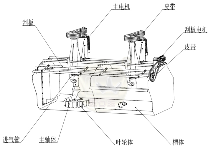 (二)当叶轮旋转时,在叶轮腔内形成负压区,空气经吸气管和中心筒被吸进叶轮腔,同时矿浆经中心筒及盖板上的循环也吸进叶轮腔,在此完成了气液混合,混合后的矿浆即以较大的切向和径向动量失离叶轮叶片,通过盖板较均匀地散到槽中,大量的矿化气泡和一部分矿浆升到浮选槽上部,刮板将泡沫刮出,剩余的矿浆返回下部再循环。