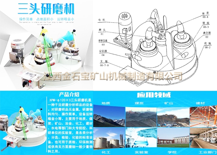 磨头,研钵支座和离合器互成120°均匀地安装在转座上,转座装在底座的轴承中,在底座正面装有接料支板及电器,左方装有电机。当离合器接通时,电机通过皮带轮,齿轮轴,万向节带动磨头旋转。齿轮轴的另一头和研钵支座的齿轮啮合。由于研棒的正转和研钵的同向自转产生相对滑动,借磨头的自重产生压力磨细物料。