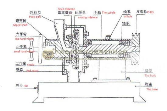 3、调节机构的原理是:松开大手轮,旋转小手轮,使调节螺杆转动推动主轴,使活动盘前进或后退。调节两磨盘的间隙,可调节的物料粒度。
