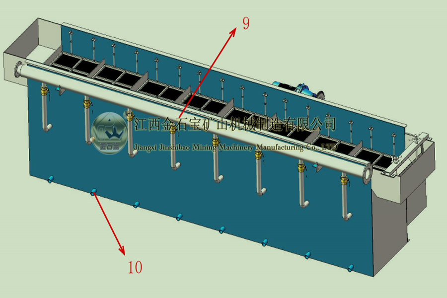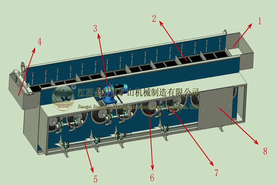 运动过程中比重大的矿物下沉,从底部出矿口排出,比重轻的砂料上浮,通过尾矿出砂槽排出。