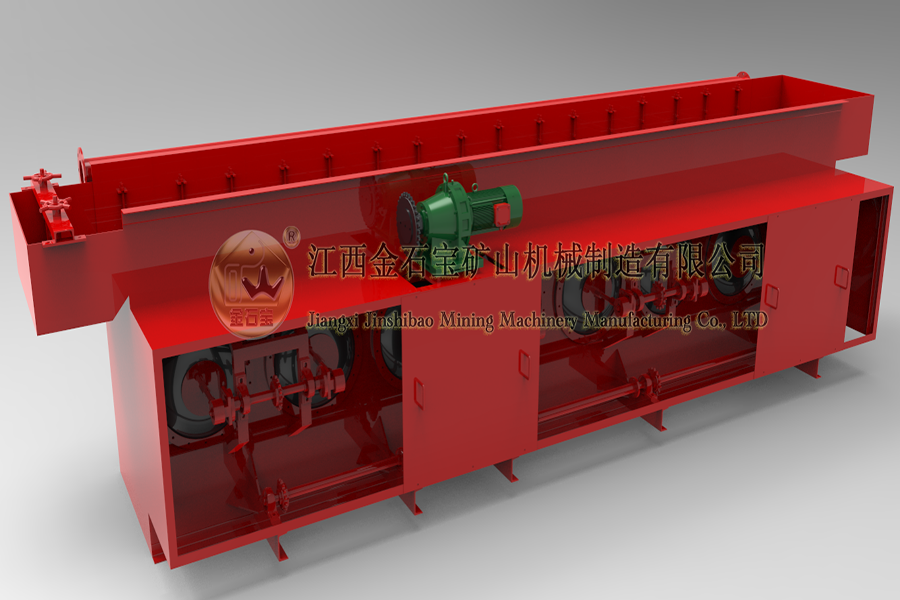 电机通过链条带动底部传动轴旋转,传动轴通过链条带动传动装置运动,传动装置推动鼓膜做往复运动,洗砂室里的物料在往复