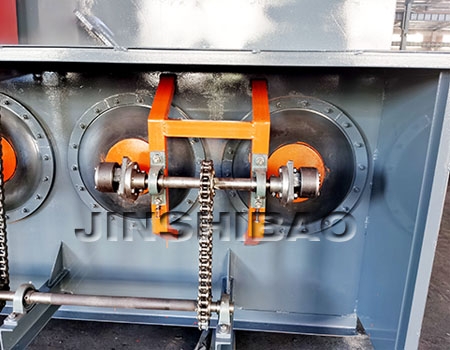电机通过链条带动底部传动轴旋转,传动轴通过链条带动传动装置运动,传动装置推动鼓膜做往复运动,洗砂室里的物料在往复